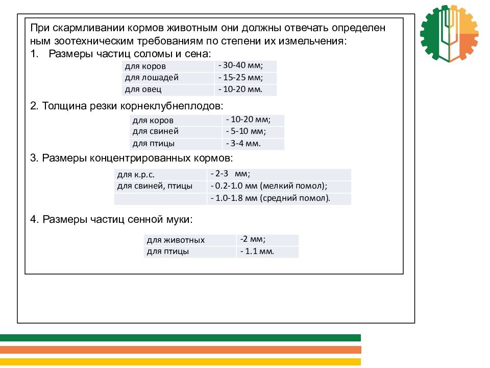 При скармливании кормов животным они должны отвечать определенным зоотехническим требованиям по степени их измельчения: Размеры частиц соломы и сена: 2. Толщина резки корнеклубнеплодов : 3. Размеры концентрированных кормов: для коров - 30-40 мм; для лошадей - 15-25 мм; для овец - 10-20 мм. для коров - 10-20 мм; для свиней - 5-10 мм; для птицы - 3-4 мм. для к.р.с. - 2-3 мм; для свиней, птицы - 0.2-1.0 мм (мелкий помол); - 1.0-1.8 мм (средний помол). для животных -2 мм; для птицы - 1.1 мм. 4. Размеры частиц сенной муки:
