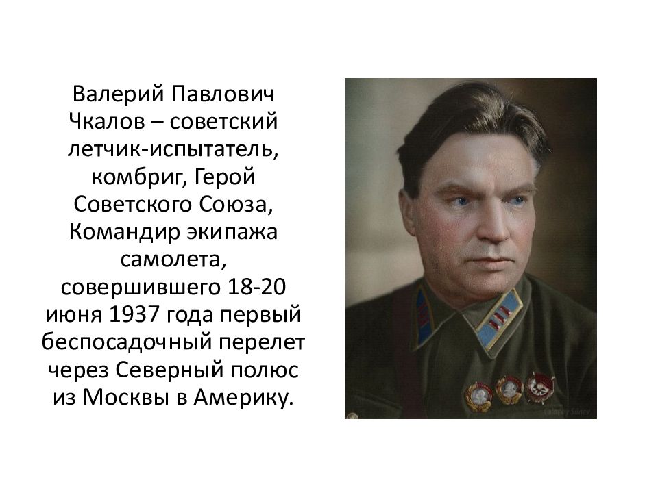 Валерий Павлович Чкалов – советский летчик-испытатель, комбриг, Герой Советского Союза, Командир экипажа самолета, совершившего 18-20 июня 1937 года первый беспосадочный перелет через Северный полюс из Москвы в Америку.