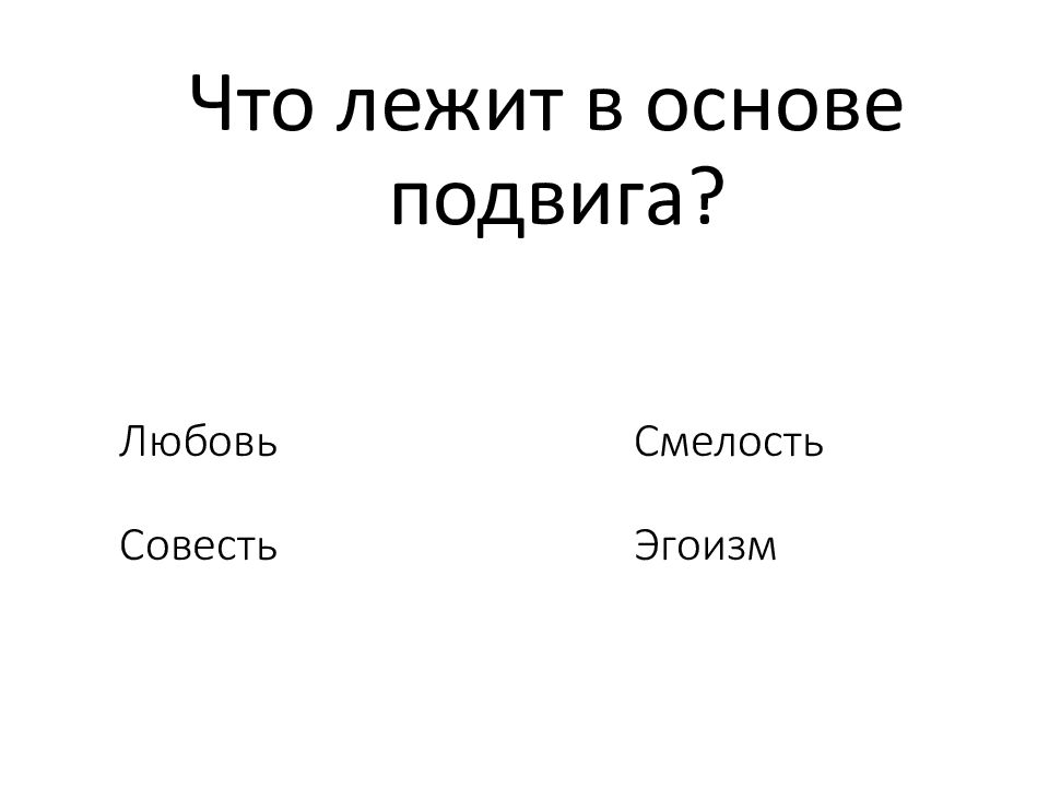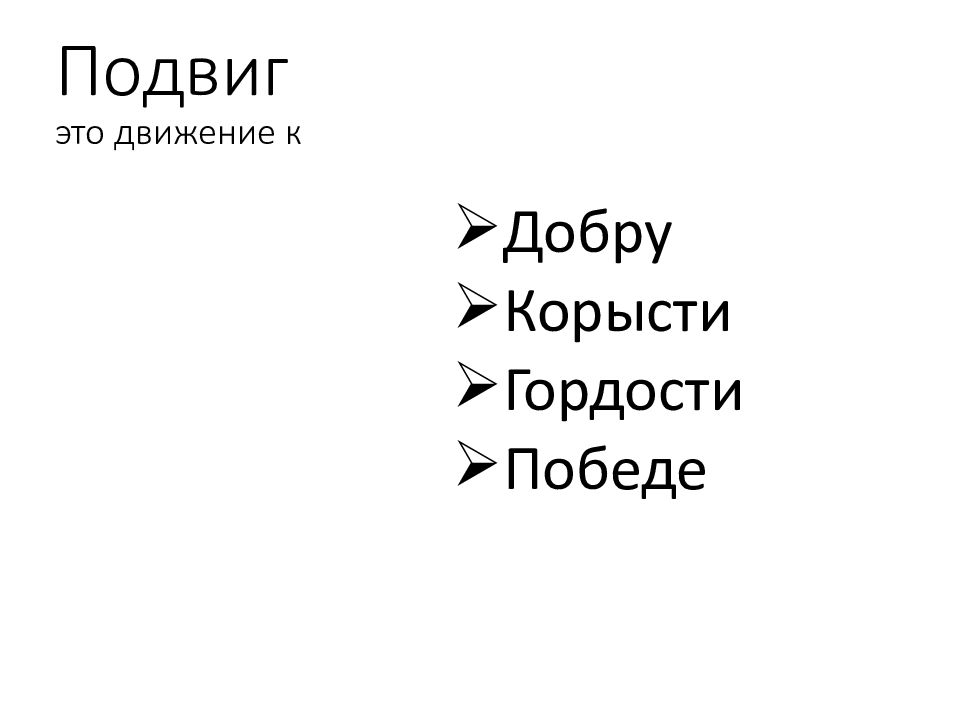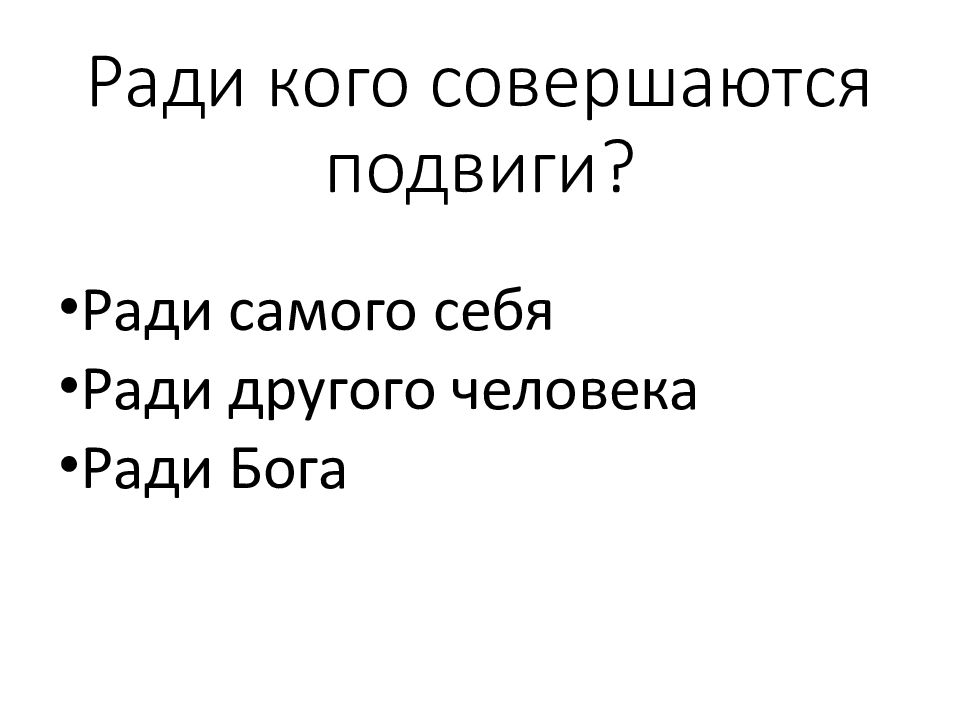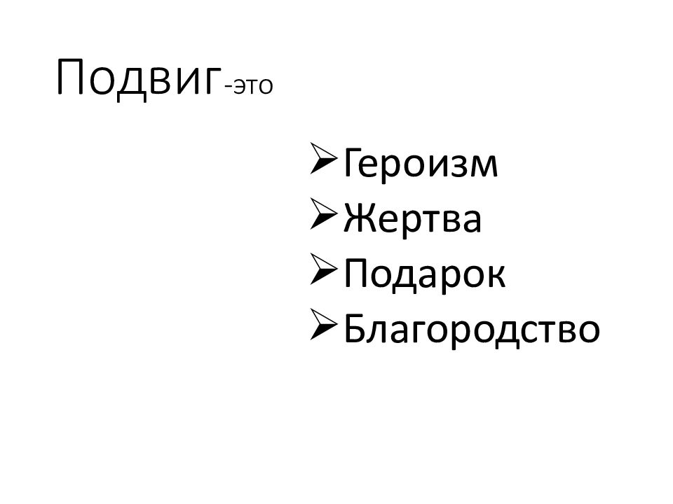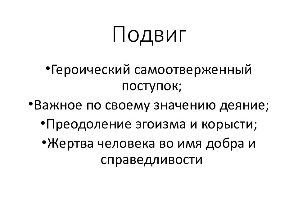 Героический самоотверженный поступок; Важное по своему значению деяние; Преодоление эгоизма и корысти; Жертва человека во имя добра и справедливости