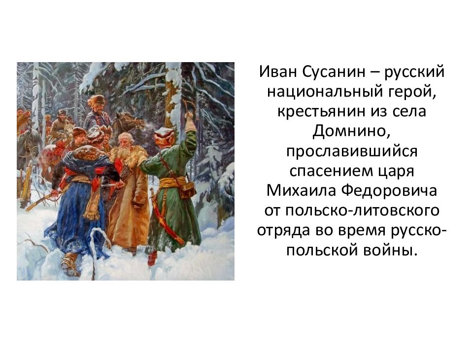 Иван Сусанин – русский национальный герой, крестьянин из села Домнино, прославившийся спасением царя Михаила Федоровича от польско-литовского отряда во время русско-польской войны.