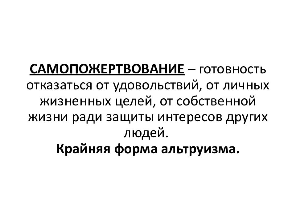 САМОПОЖЕРТВОВАНИЕ – готовность отказаться от удовольствий, от личных жизненных целей, от собственной жизни ради защиты интересов других людей. Крайняя форма альтруизма.