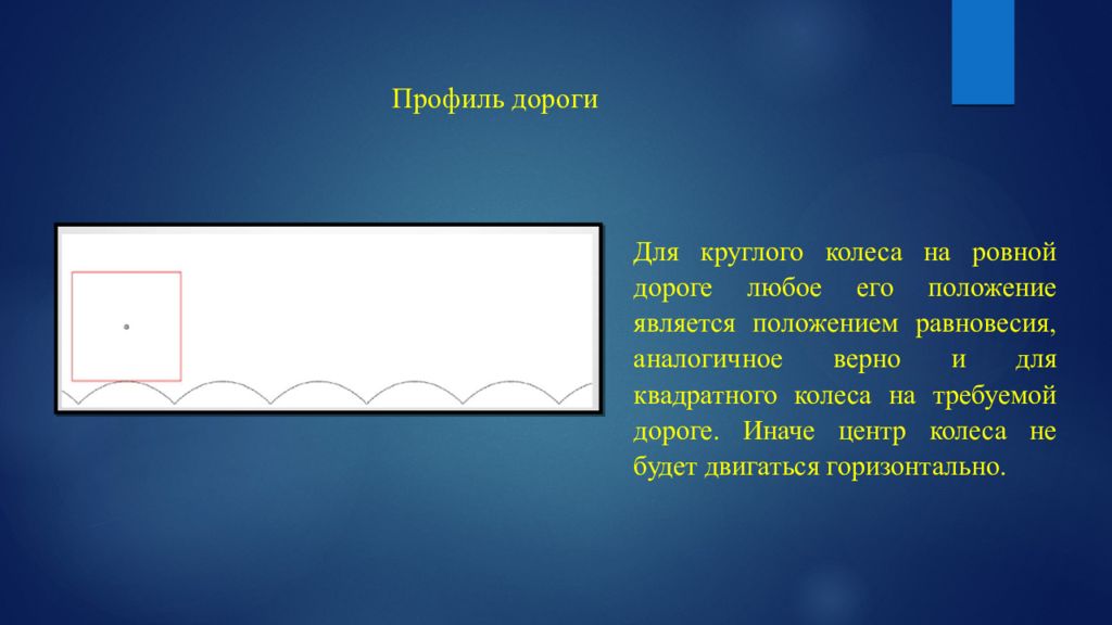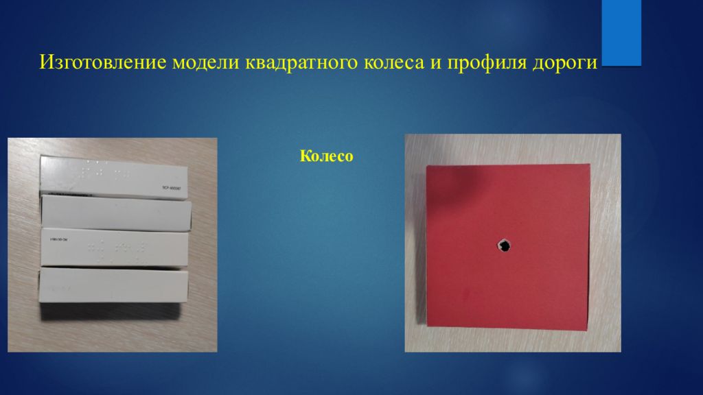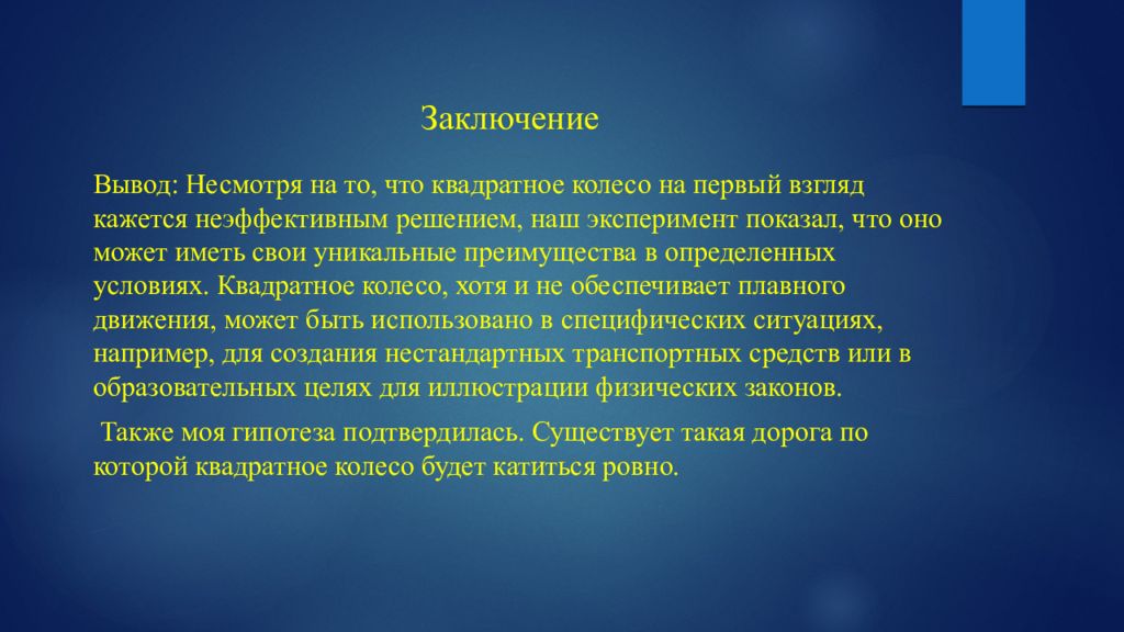 Вывод : Несмотря на то, что квадратное колесо на первый взгляд кажется неэффективным решением, наш эксперимент показал, что оно может иметь свои уникальные преимущества в определенных условиях. Квадратное колесо, хотя и не обеспечивает плавного движения, может быть использовано в специфических ситуациях, например, для создания нестандартных транспортных средств или в образовательных целях для иллюстрации физических законов. Также моя гипотеза подтвердилась. Существует такая дорога по которой квадратное колесо будет катиться ровно.