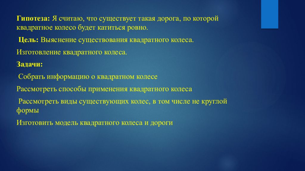 Гипотеза: Я считаю, что существует такая дорога, по которой квадратное колесо будет катиться ровно. Цель: Выяснение существования квадратного колеса. Изготовление квадратного колеса. Задачи: Собрать информацию о квадратном колесе Рассмотреть способы применения квадратного колеса Рассмотреть виды существующих колес, в том числе не круглой формы Изготовить модель квадратного колеса и дороги