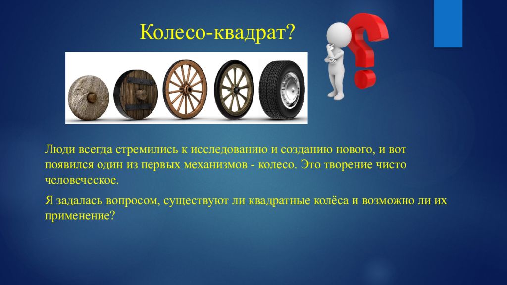 Люди всегда стремились к исследованию и созданию нового, и вот появился один из первых механизмов - колесо. Это творение чисто человеческое. Я задалась вопросом, существуют ли квадратные колёса и возможно ли их применение?
