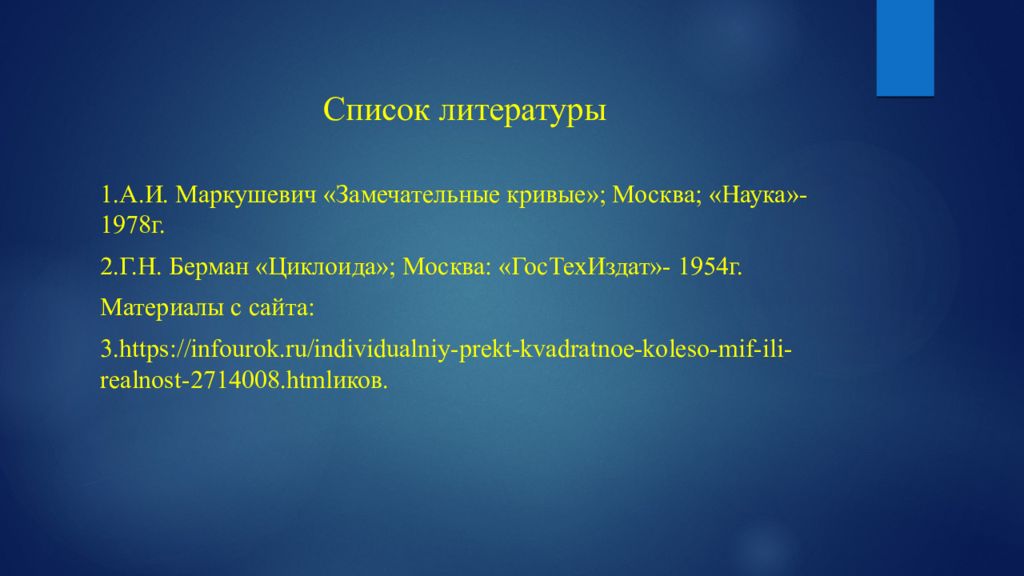 1.А.И. Маркушевич «Замечательные кривые»; Москва; «Наука»-1978г. 2.Г.Н. Берман «Циклоида»; Москва: « ГосТехИздат »- 1954г. Материалы с сайта: 3.https://infourok.ru/individualniy-prekt-kvadratnoe-koleso-mif-ili-realnost-2714008.htmlиков.