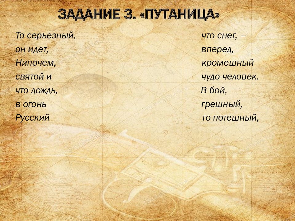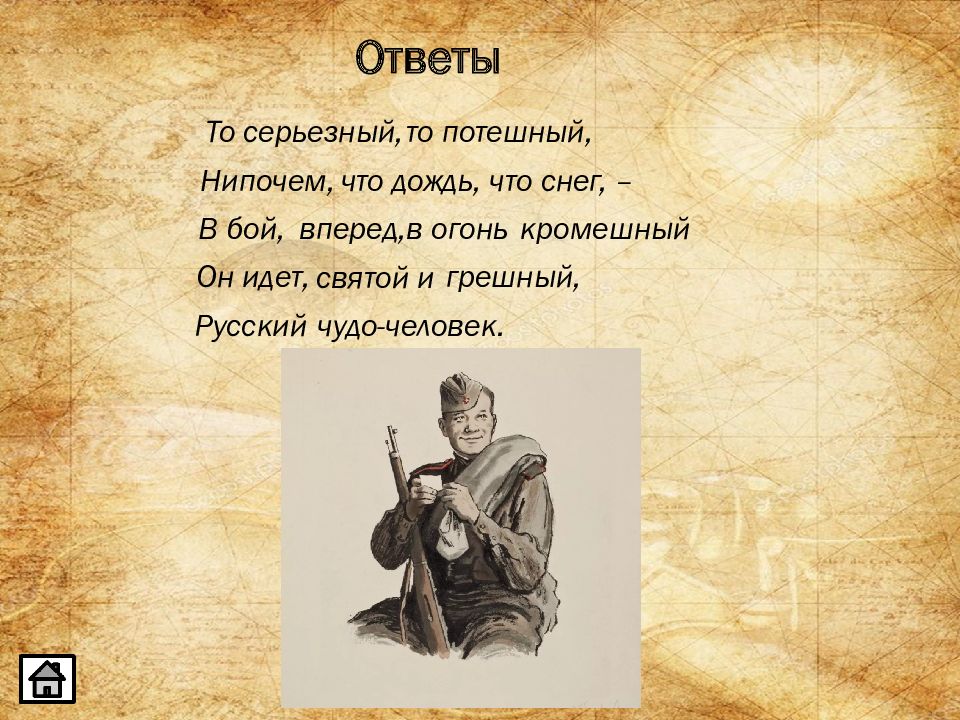 То серьезный, Он идет, Нипочем, святой и что дождь, в огонь Русский что снег, – вперед, кромешный чудо-человек. В бой, грешный, то потешный, Ответы