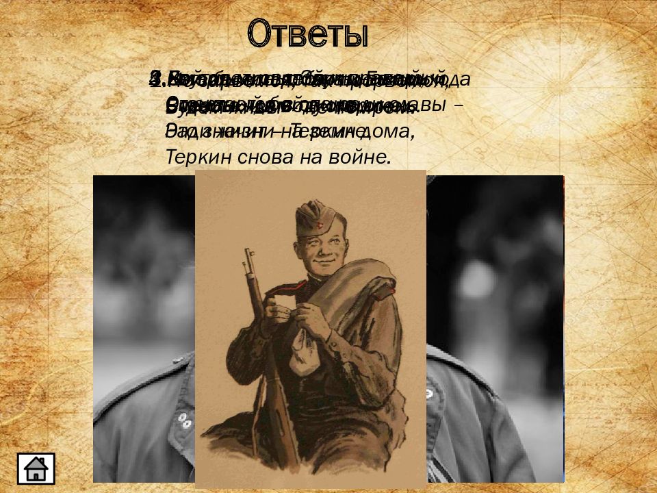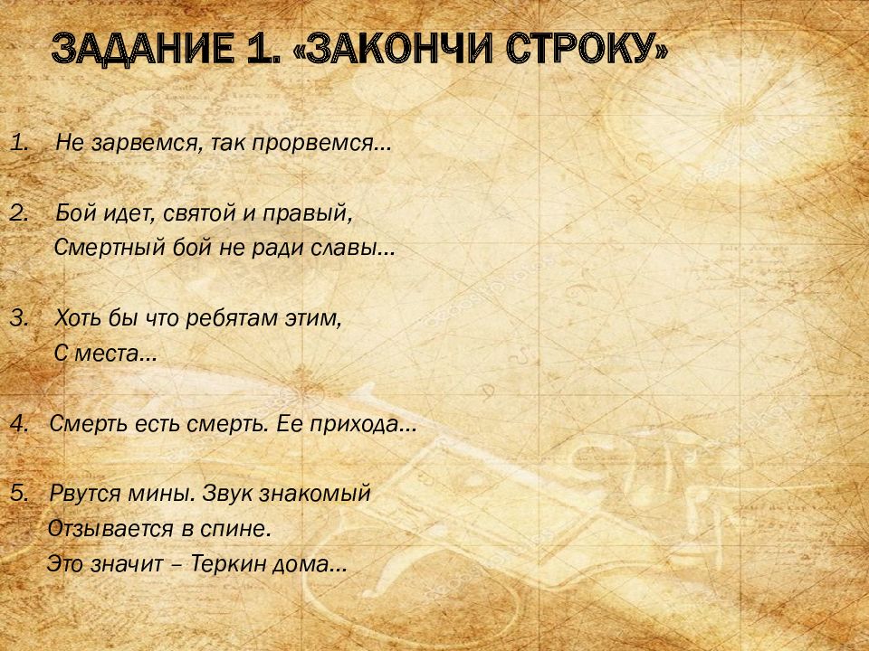 Ответы 1.Не зарвемся, так прорвемся, Будем живы – не помрем. 2.Бой идет, святой и правый, Смертный бой не ради славы – Ради жизни на земле. 3.Хоть бы что ребятам этим, С места – в воду и в огонь. 4.Смерть есть смерть. Ее прихода Все мы ждем по старине. 5.Рвутся мины. Звук знакомый Отзывается в спине. Это значит – Теркин дома, Теркин снова на войне.