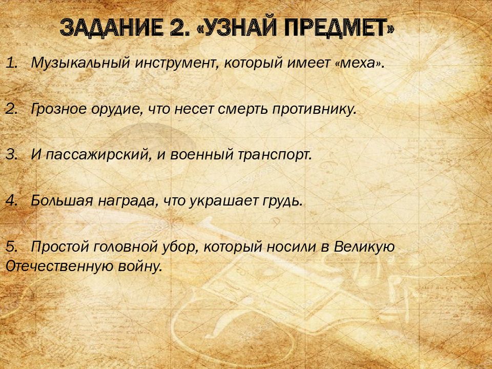 1. Музыкальный инструмент, который имеет «меха». 2. Грозное орудие, что несет смерть противнику. 3. И пассажирский, и военный транспорт. 4. Большая награда, что украшает грудь. 5. Простой головной убор, который носили в Великую Отечественную войну.