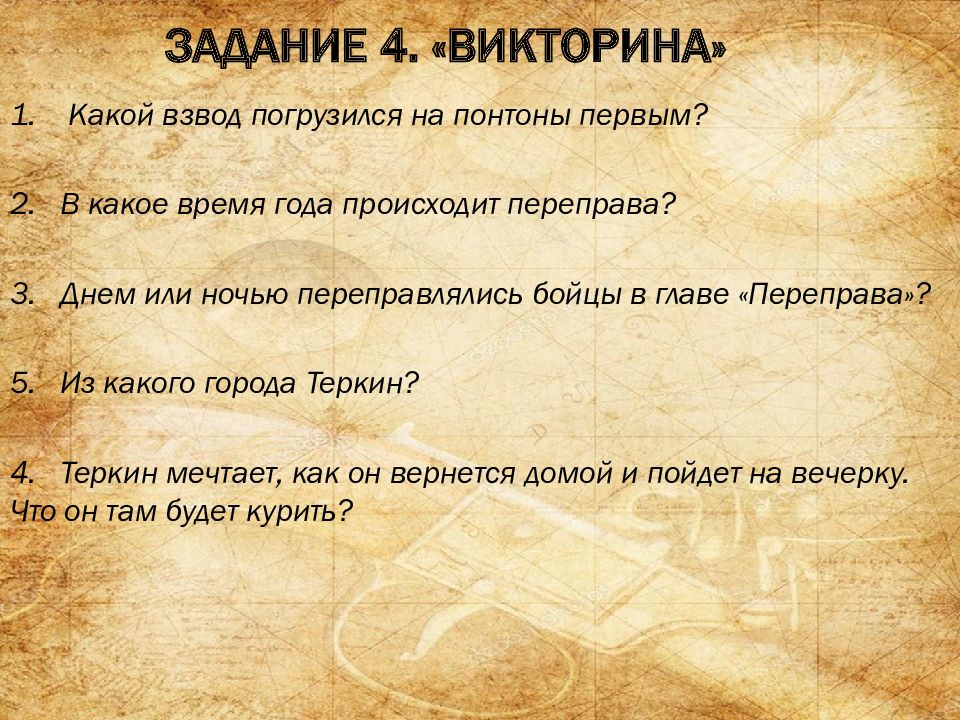 1. Какой взвод погрузился на понтоны первым? 2. В какое время года происходит переправа ? 3. Днем или ночью переправлялись бойцы в главе «Переправа »? 5. Из какого города Теркин? 4. Теркин мечтает, как он вернется домой и пойдет на вечерку. Что он там будет курить ?