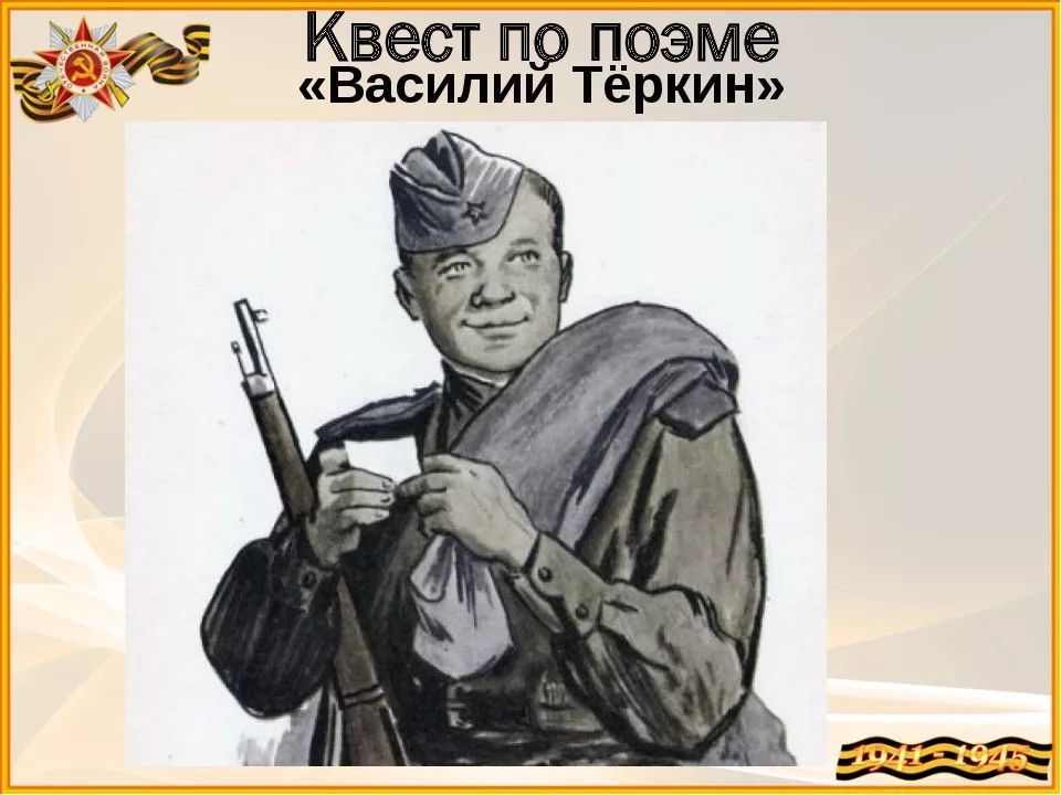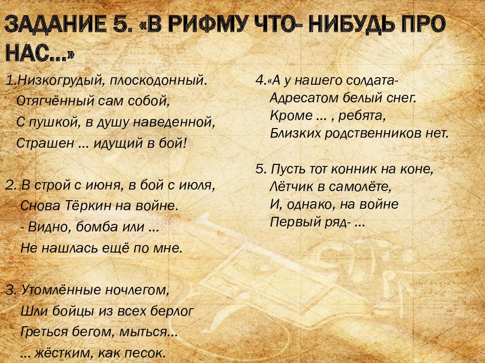 1.Низкогрудый, плоскодонный. Отягчённый сам собой, С пушкой, в душу наведенной, Страшен … идущий в бой ! 2. В строй с июня, в бой с июля, Снова Тёркин на войне. - Видно, бомба или … Не нашлась ещё по мне. 3. Утомлённые ночлегом, Шли бойцы из всех берлог Греться бегом, мыться … … жёстким, как песок. 4.«А у нашего солдата- Адресатом белый снег. Кроме …, ребята, Близких родственников нет. 5. Пусть тот конник на коне, Лётчик в самолёте, И, однако, на войне Первый ряд- …