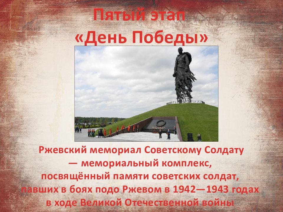 Пятый этап « День Победы» Ржевский мемориал Советскому Солдату — мемориальный комплекс, посвящённый памяти советских солдат, павших в боях подо Ржевом в 1942—1943 годах в ходе Великой Отечественной войны