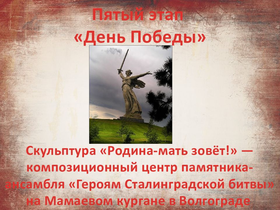 Пятый этап « День Победы» Скульптура «Родина-мать зовёт!» — композиционный центр памятника-ансамбля «Героям Сталинградской битвы» на Мамаевом кургане в Волгограде