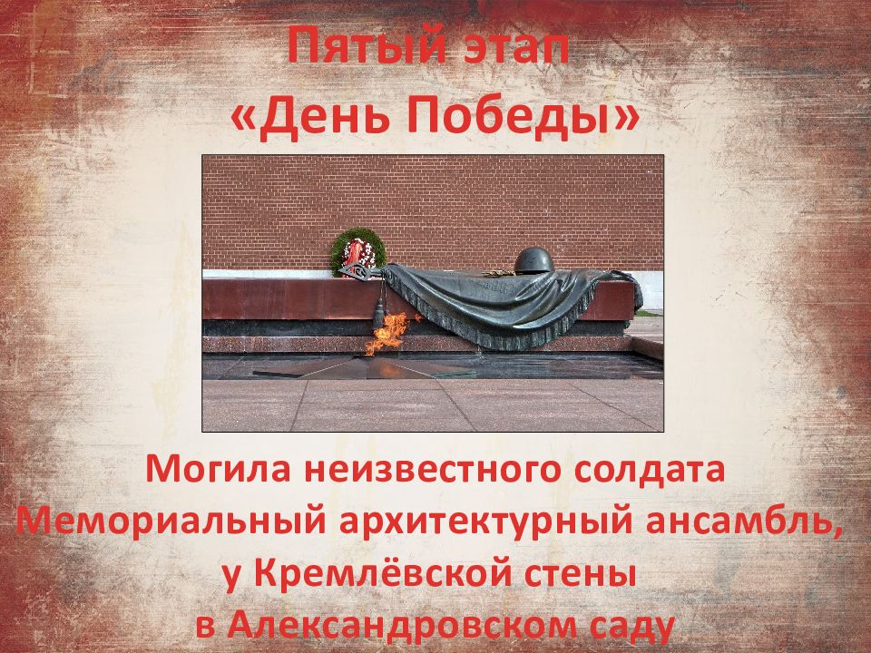 Пятый этап « День Победы» Могила н еизвестного солдата Мемориальный архитектурный ансамбль, у Кремлёвской стены в Александровском саду