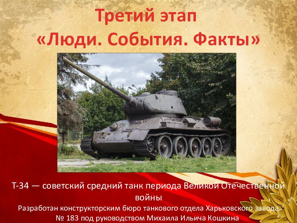 Третий этап « Люди. События. Факты» T-34 — советский средний танк периода Великой Отечественной войны Разработан конструкторским бюро танкового отдела Харьковского завода № 183 под руководством Михаила Ильича Кошкина