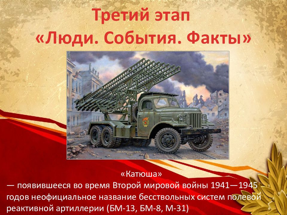 Третий этап « Люди. События. Факты» «Катюша» — появившееся во время Второй мировой войны 1941—1945 годов неофициальное название бесствольных систем полевой реактивной артиллерии (БМ-13, БМ-8, М-31)