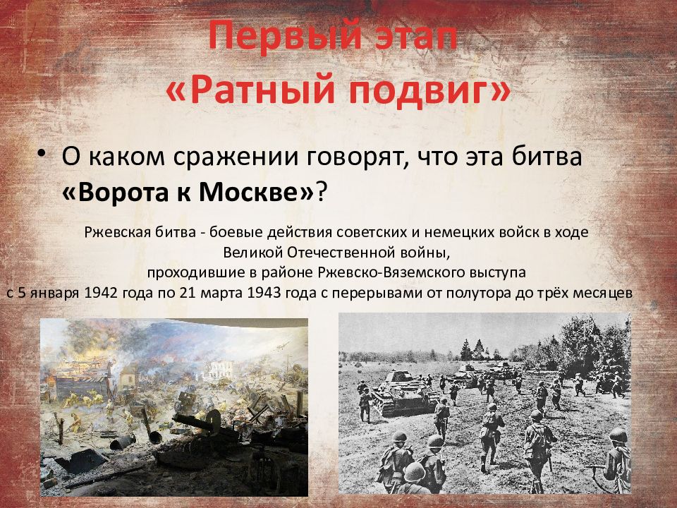 О каком сражении говорят, что эта битва «Ворота к Москве» ? Первый этап «Ратный подвиг» Ржевская битва - боевые действия советских и немецких войск в ходе Великой Отечественной войны, проходившие в районе Ржевско-Вяземского выступа с 5 января 1942 года по 21 марта 1943 года с перерывами от полутора до трёх месяцев