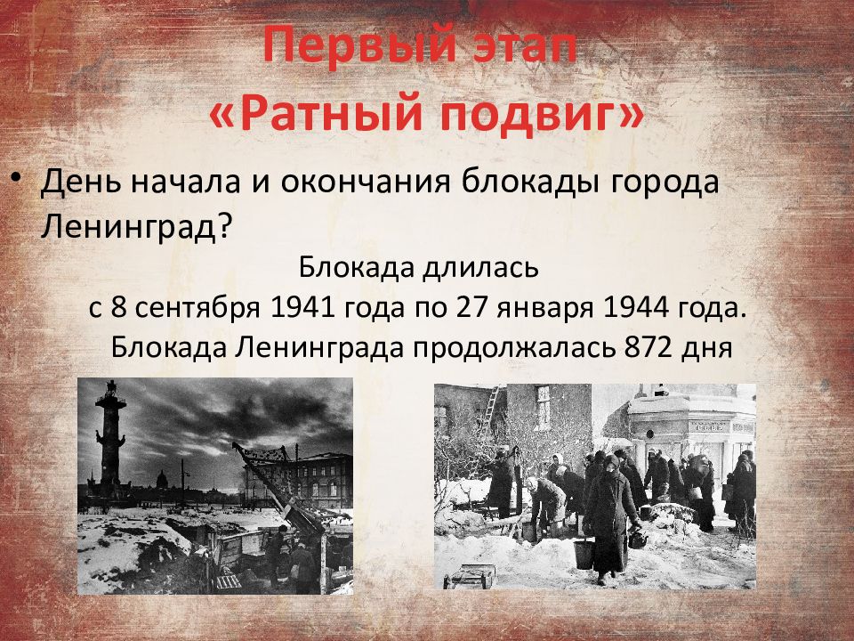 День начала и окончания блокады города Ленинград? Первый этап «Ратный подвиг» Блокада длилась с 8 сентября 1941 года по 27 января 1944 года. Блокада Ленинграда продолжалась 872 дня