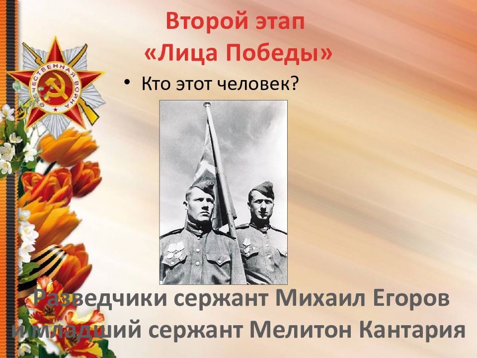Кто этот человек? Второй этап «Лица Победы» Разведчики сержант Михаил Егоров и младший сержант Мелитон Кантария
