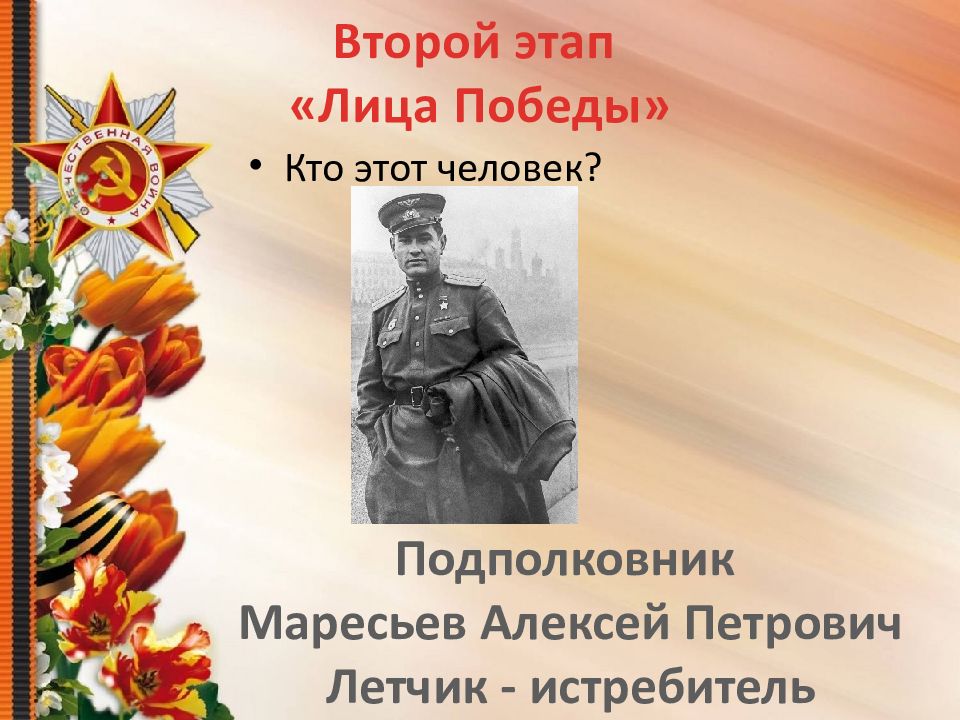 Кто этот человек? Второй этап «Лица Победы» Подполковник Маресьев Алексей Петрович Летчик - истребитель