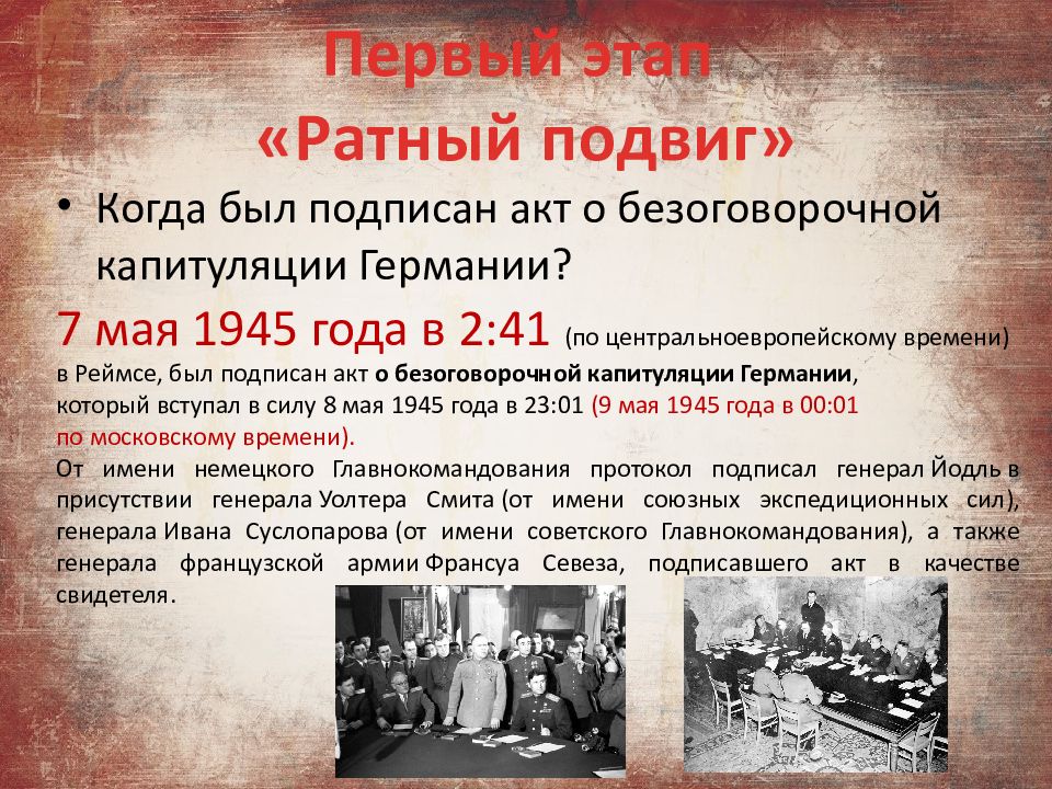 Когда был подписан акт о безоговорочной капитуляции Германии? Первый этап «Ратный подвиг» 7 мая 1945 года в 2:41 (по центральноевропейскому времени) в Реймсе, был подписан акт о безоговорочной капитуляции Германии, который вступал в силу 8 мая 1945 года в 23:01 (9 мая 1945 года в 00:01 по московскому времени). От имени немецкого Главнокомандования протокол подписал генерал Йодль в присутствии генерала Уолтера Смита (от имени союзных экспедиционных сил), генерала Ивана Суслопарова (от имени советского Главнокомандования), а также генерала французской армии Франсуа Севеза, подписавшего акт в качестве свидетеля.
