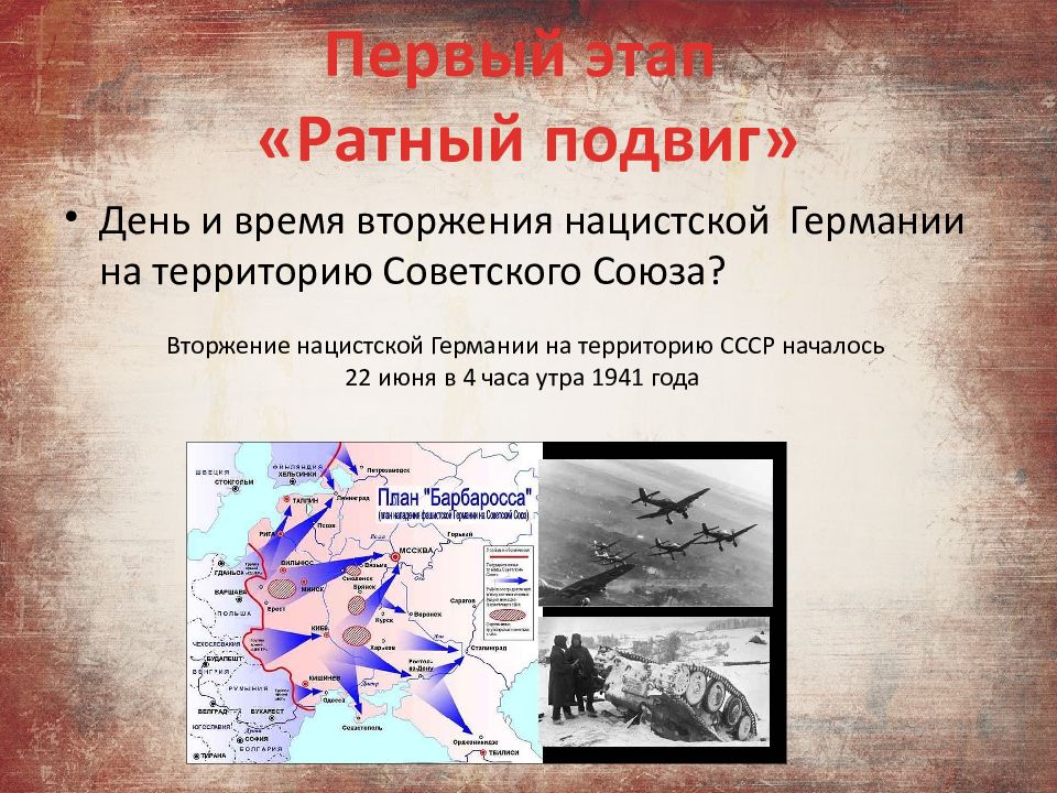 День и время вторжения нацистской Германии на территорию Советского Союза? Первый этап «Ратный подвиг» Вторжение нацистской Германии на территорию СССР началось 22 июня в 4 часа утра 1941 года