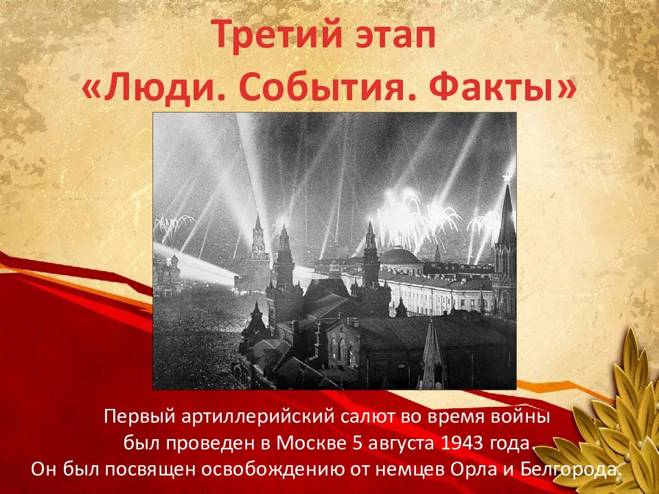 Третий этап « Люди. События. Факты» Первый артиллерийский салют во время войны был проведен в Москве 5 августа 1943 года. Он был посвящен освобождению от немцев Орла и Белгорода.