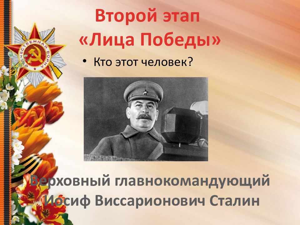 Кто этот человек? Второй этап «Лица Победы» Верховный главнокомандующий Иосиф Виссарионович Сталин