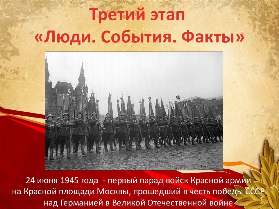 Третий этап « Люди. События. Факты» 24 июня 1945 года - первый парад войск Красной армии на Красной площади Москвы, прошедший в честь победы СССР над Германией в Великой Отечественной войне