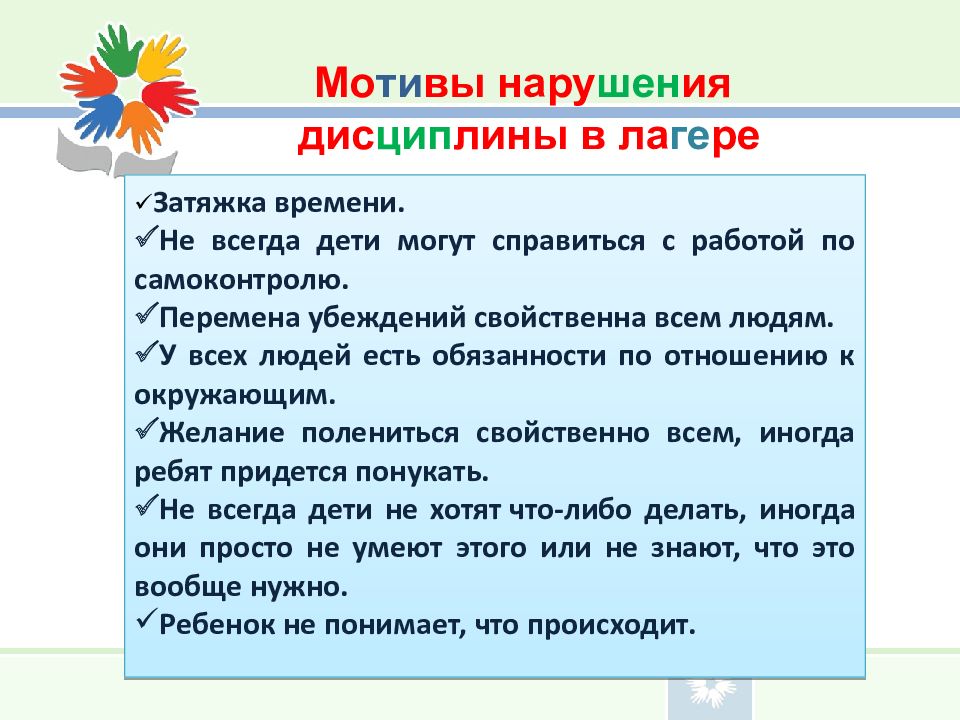 Мо ти вы нару шен ия дис цип лины в ла ге ре Затяжка времени. Не всегда дети могут справиться с работой по самоконтролю. Перемена убеждений свойственна всем людям. У всех людей есть обязанности по отношению к окружающим. Желание полениться свойственно всем, иногда ребят придется понукать. Не всегда дети не хотят что-либо делать, иногда они просто не умеют этого или не знают, что это вообще нужно. Ребенок не понимает, что происходит.