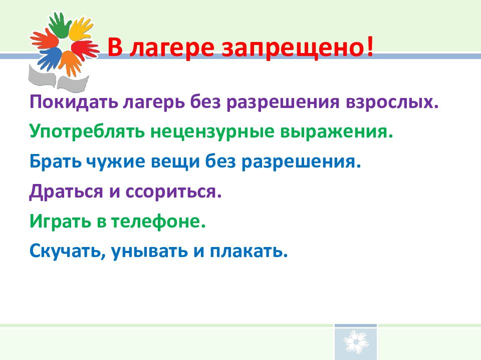 Покидать лагерь без разрешения взрослых. Употреблять нецензурные выражения. Брать чужие вещи без разрешения. Драться и ссориться. Играть в телефоне. Скучать, унывать и плакать.