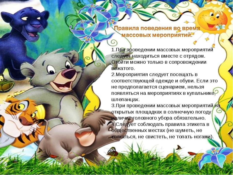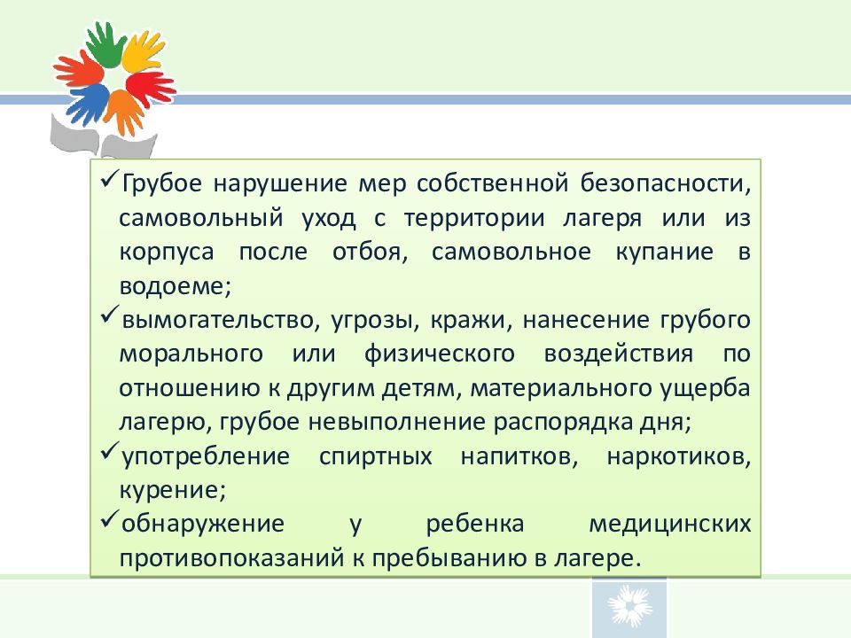 Грубое нарушение мер собственной безопасности, самовольный уход с территории лагеря или из корпуса после отбоя, самовольное купание в водоеме; вымогательство, угрозы, кражи, нанесение грубого морального или физического воздействия по отношению к другим детям, материального ущерба лагерю, грубое невыполнение распорядка дня; употребление спиртных напитков, наркотиков, курение; обнаружение у ребенка медицинских противопоказаний к пребыванию в лагере.