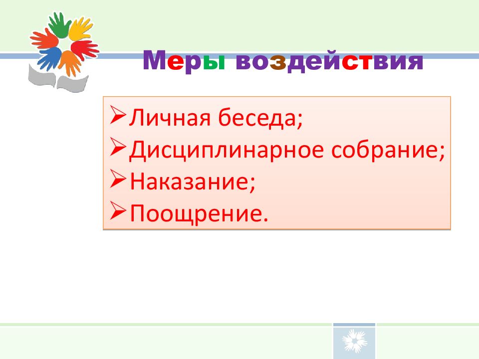 М е р ы во з дей ст вия Личная беседа; Дисциплинарное собрание; Наказание; Поощрение.