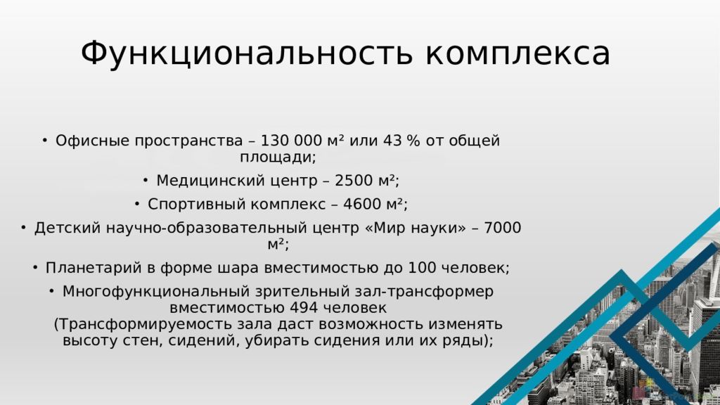 Офисные пространства – 130 000 м² или 43 % от общей площади; Медицинский центр – 2500 м²; Спортивный комплекс – 4600 м²; Детский научно-образовательный центр «Мир науки» – 7000 м²; Планетарий в форме шара вместимостью до 100 человек; Многофункциональный зрительный зал- трансформер вместимостью 494 человек ( Трансформируемость зала даст возможность изменять высоту стен, сидений, убирать сидения или их ряды);