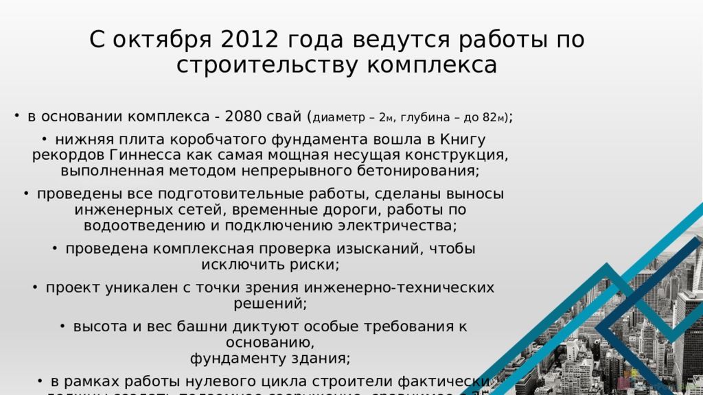 в основании комплекса - 2080 свай ( диаметр – 2 м, глубина – до 82 м ) ; нижняя плита коробчатого фундамента вошла в Книгу рекордов Гиннесса как самая мощная несущая конструкция, выполненная методом непрерывного бетонирования; проведены все подготовительные работы, сделаны выносы инженерных сетей, временные дороги, работы по водоотведению и подключению электричества ; проведена комплексная проверка изысканий, чтобы исключить риски; п роект уникален с точки зрения инженерно-технических решений; высота и вес башни диктуют особые требования к основанию, фундаменту здания; в рамках работы нулевого цикла строители фактически должны создать подземное сооружение, сравнимое с 25-этажным домом