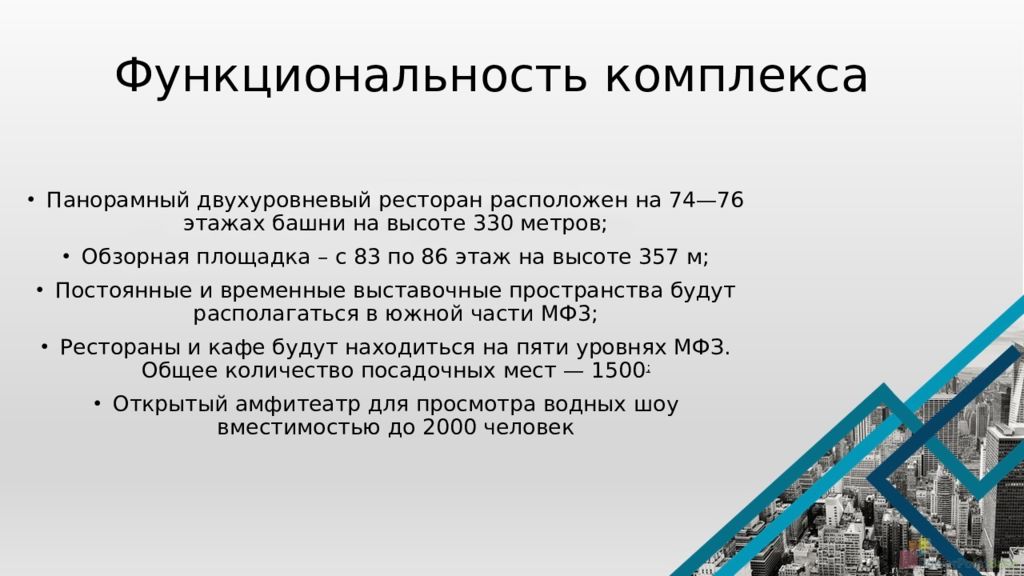 Панорамный двухуровневый ресторан расположен на 74—76 этажах башни на высоте 330 метров; Обзорная площадка – с 83 по 86 этаж на высоте 357 м; Постоянные и временные выставочные пространства будут располагаться в южной части МФ3; Рестораны и кафе будут находиться на пяти уровнях МФЗ. Общее количество посадочных мест — 1500 ; Открытый амфитеатр для просмотра водных шоу вместимостью до 2000 человек