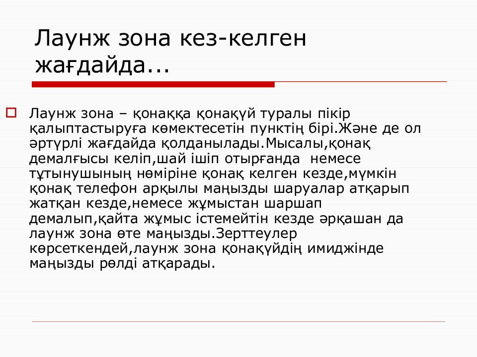 Лаунж зона – қонаққа қонақүй туралы пікір қалыптастыруға көмектесетін пунктің бірі.Және де ол әртүрлі жағдайда қолданылады.Мысалы,қонақ демалғысы келіп,шай ішіп отырғанда немесе тұтынушының нөміріне қонақ келген кезде,мүмкін қонақ телефон арқылы маңызды шаруалар атқарып жатқан кезде,немесе жұмыстан шаршап демалып,қайта жұмыс істемейтін кезде әрқашан да лаунж зона өте маңызды.Зерттеулер көрсеткендей,лаунж зона қонақүйдің имиджінде маңызды рөлді атқарады.