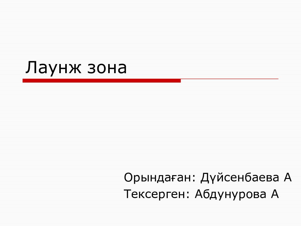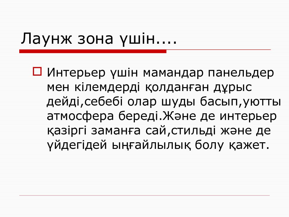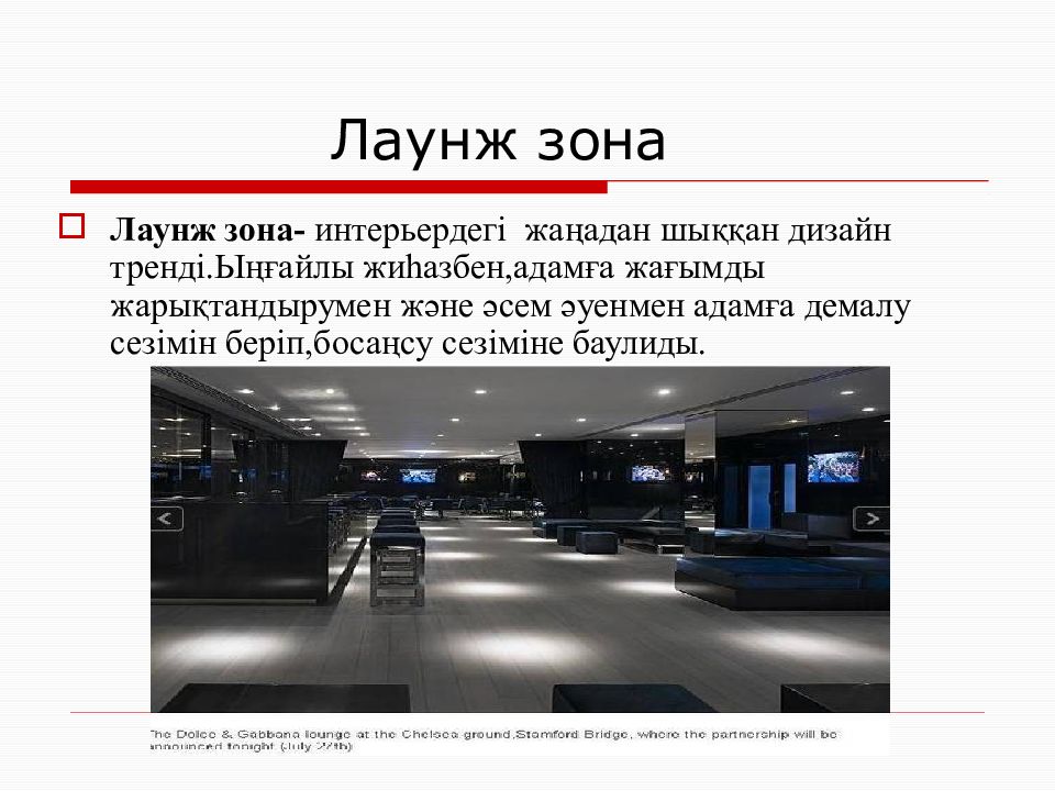 Лаунж зона- интерьердегі жаңадан шыққан дизайн тренді.Ыңғайлы жиһазбен,адамға жағымды жарықтандырумен және әсем әуенмен адамға демалу сезімін беріп,босаңсу сезіміне баулиды.