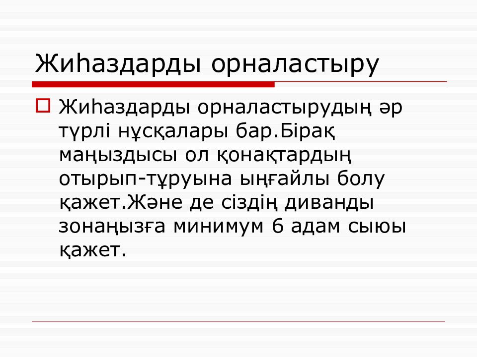 Жиһаздарды орналастырудың әр түрлі нұсқалары бар.Бірақ маңыздысы ол қонақтардың отырып-тұруына ыңғайлы болу қажет.Және де сіздің диванды зонаңызға минимум 6 адам сыюы қажет.