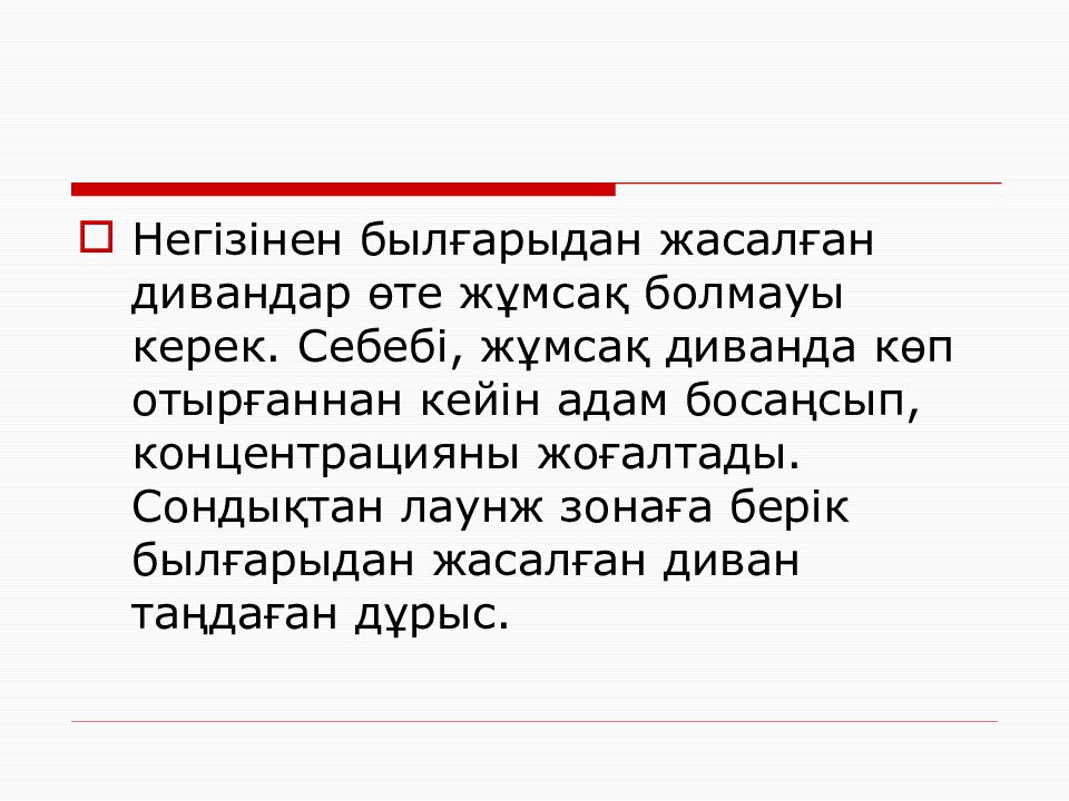 Негізінен былғарыдан жасалған дивандар өте жұмсақ болмауы керек. Себебі, жұмсақ диванда көп отырғаннан кейін адам босаңсып, концентрацияны жоғалтады. Сондықтан лаунж зонаға берік былғарыдан жасалған диван таңдаған дұрыс.
