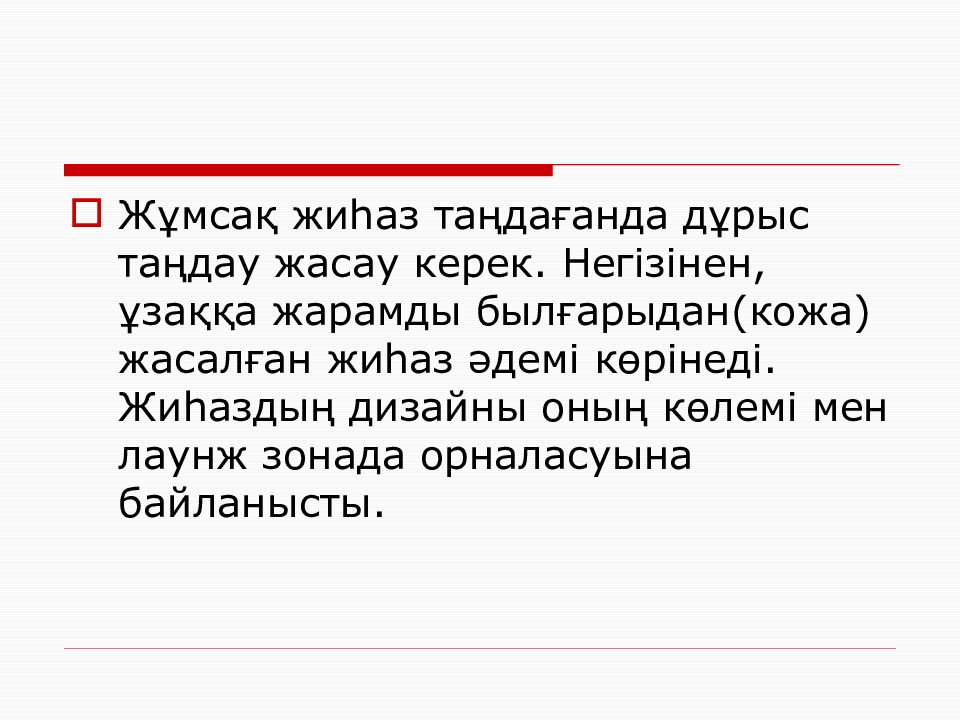 Жұмсақ жиһаз таңдағанда дұрыс таңдау жасау керек. Негізінен, ұзаққа жарамды былғарыдан(кожа) жасалған жиһаз әдемі көрінеді. Жиһаздың дизайны оның көлемі мен лаунж зонада орналасуына байланысты.