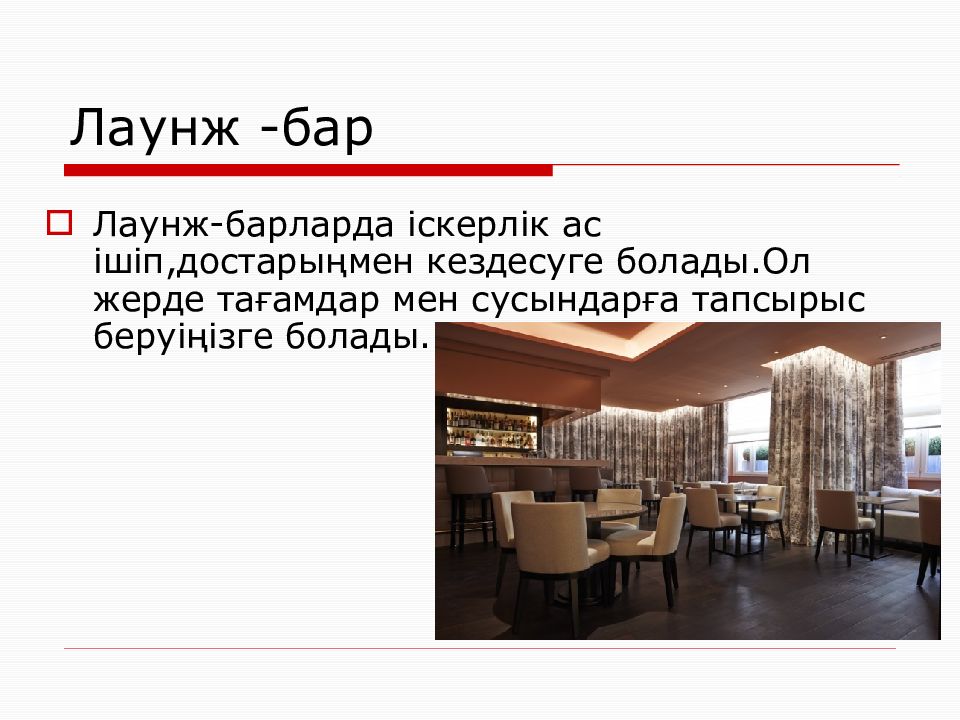 Лаунж-барларда іскерлік ас ішіп,достарыңмен кездесуге болады.Ол жерде тағамдар мен сусындарға тапсырыс беруіңізге болады.