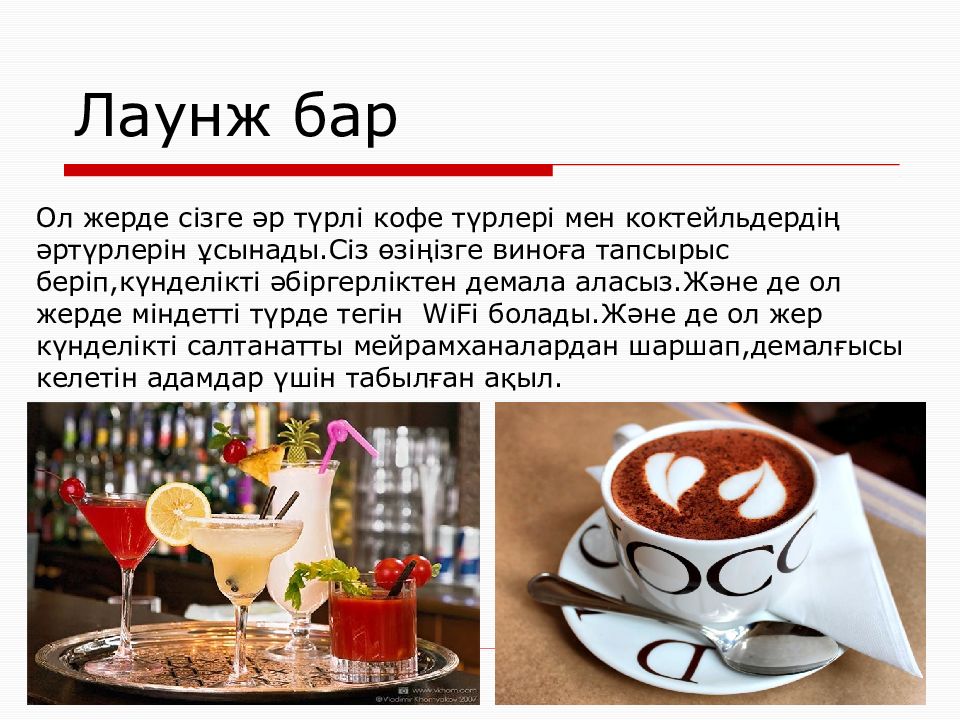 Ол жерде сізге әр түрлі кофе түрлері мен коктейльдердің әртүрлерін ұсынады.Сіз өзіңізге виноға тапсырыс беріп,күнделікті әбіргерліктен демала аласыз.Және де ол жерде міндетті түрде тегін WiFi болады.Және де ол жер күнделікті салтанатты мейрамханалардан шаршап,демалғысы келетін адамдар үшін табылған ақыл. Лаунж бар