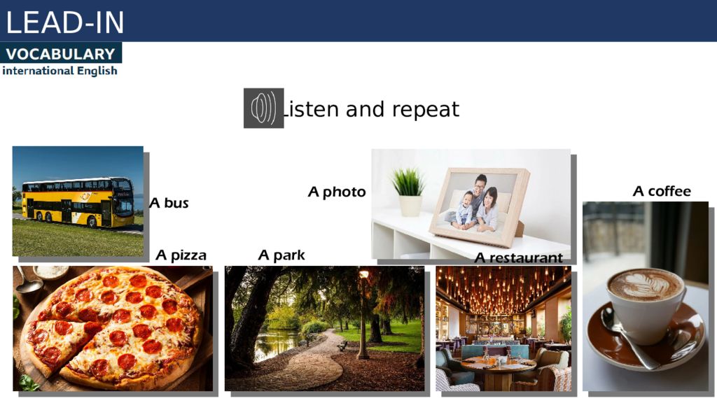 LEAD-IN Listen and repeat A bus A coffee A park A photo A pizza A restaurant