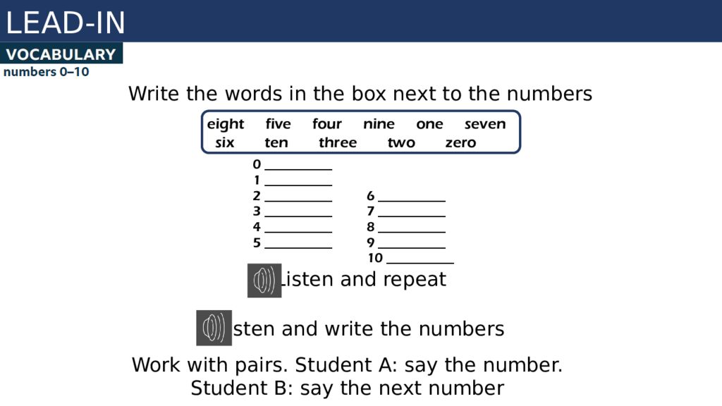 LEAD-IN Write the words in the box next to the numbers 0 __________ 1 __________ 2 __________ 3 __________ 4 __________ 5 __________ 6 __________ 7 __________ 8 __________ 9 __________ 10 __________ Listen and repeat Listen and write the numbers zero one two three five four six seven eight nine ten Work with pairs. Student A: say the number. Student B: say the next number