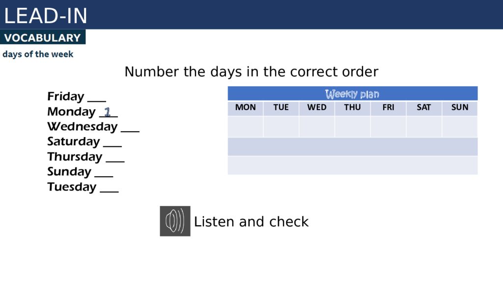 LEAD-IN Number the days in the correct order Friday ___ Monday ___ Wednesday ___ Saturday ___ Thursday ___ Sunday ___ Tuesday ___ Weekly plan MON TUE WED THU FRI SAT SUN Listen and check 1