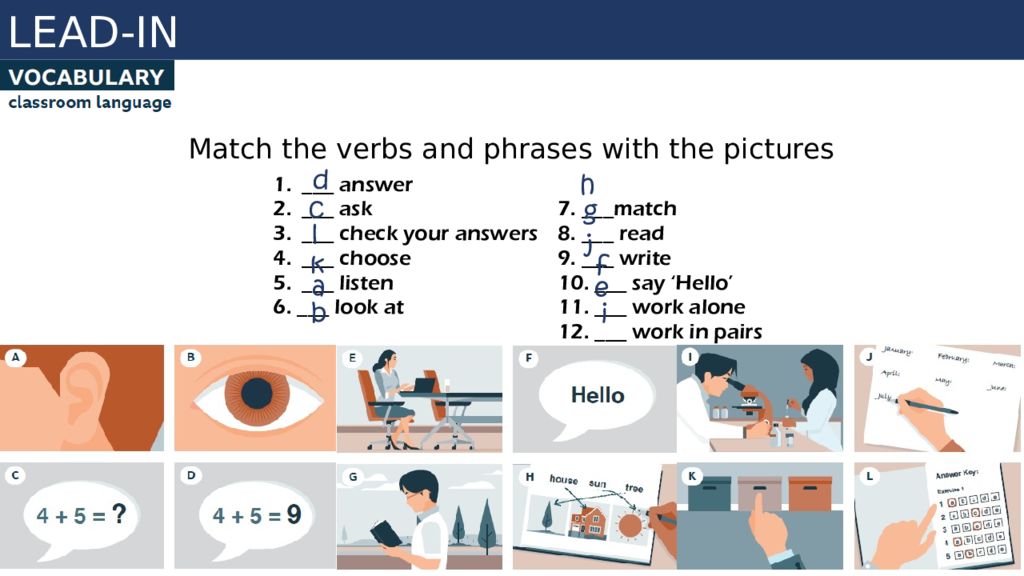 LEAD-IN Match the verbs and phrases with the pictures ___ answer ___ ask ___ check your answers ___ choose ___ listen 6. ___ look at 7. ___match 8. ___ read 9. ___ write 10. ___ say ‘Hello’ 11. ___ work alone 12. ___ work in pairs a b c d i f g h e k j l