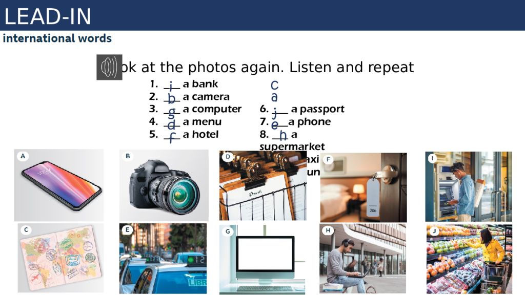 LEAD-IN Look at the photos again. Listen and repeat ___ a bank ___ a camera ___ a computer ___ a menu ___ a hotel 6. ___ a passport 7. ___a phone 8. ___ a supermarket 9. ___ a taxi 10. ___ a university a b c d e f g h i j
