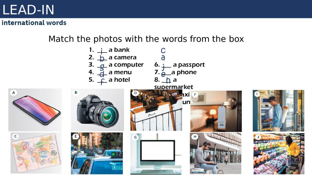 LEAD-IN Match the photos with the words from the box ___ a bank ___ a camera ___ a computer ___ a menu ___ a hotel 6. ___ a passport 7. ___a phone 8. ___ a supermarket 9. ___ a taxi 10. ___ a university a b c d e f g h i j