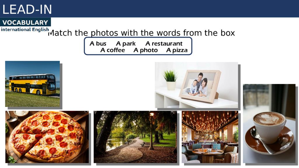 LEAD-IN Match the photos with the words from the box A bus A coffee A park A photo A pizza A restaurant