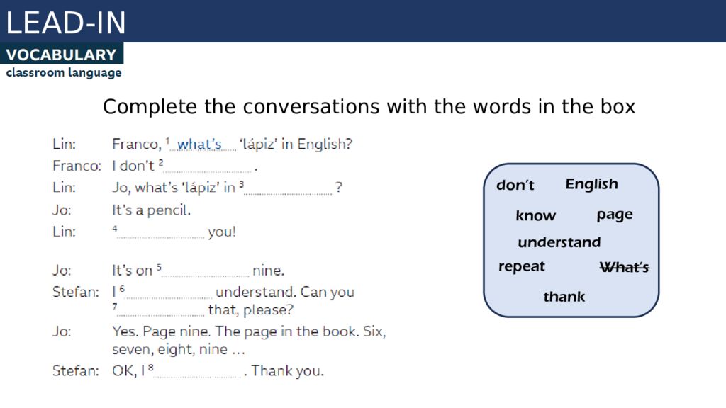 LEAD-IN Complete the conversations with the words in the box What’s understand don’t English know page repeat thank